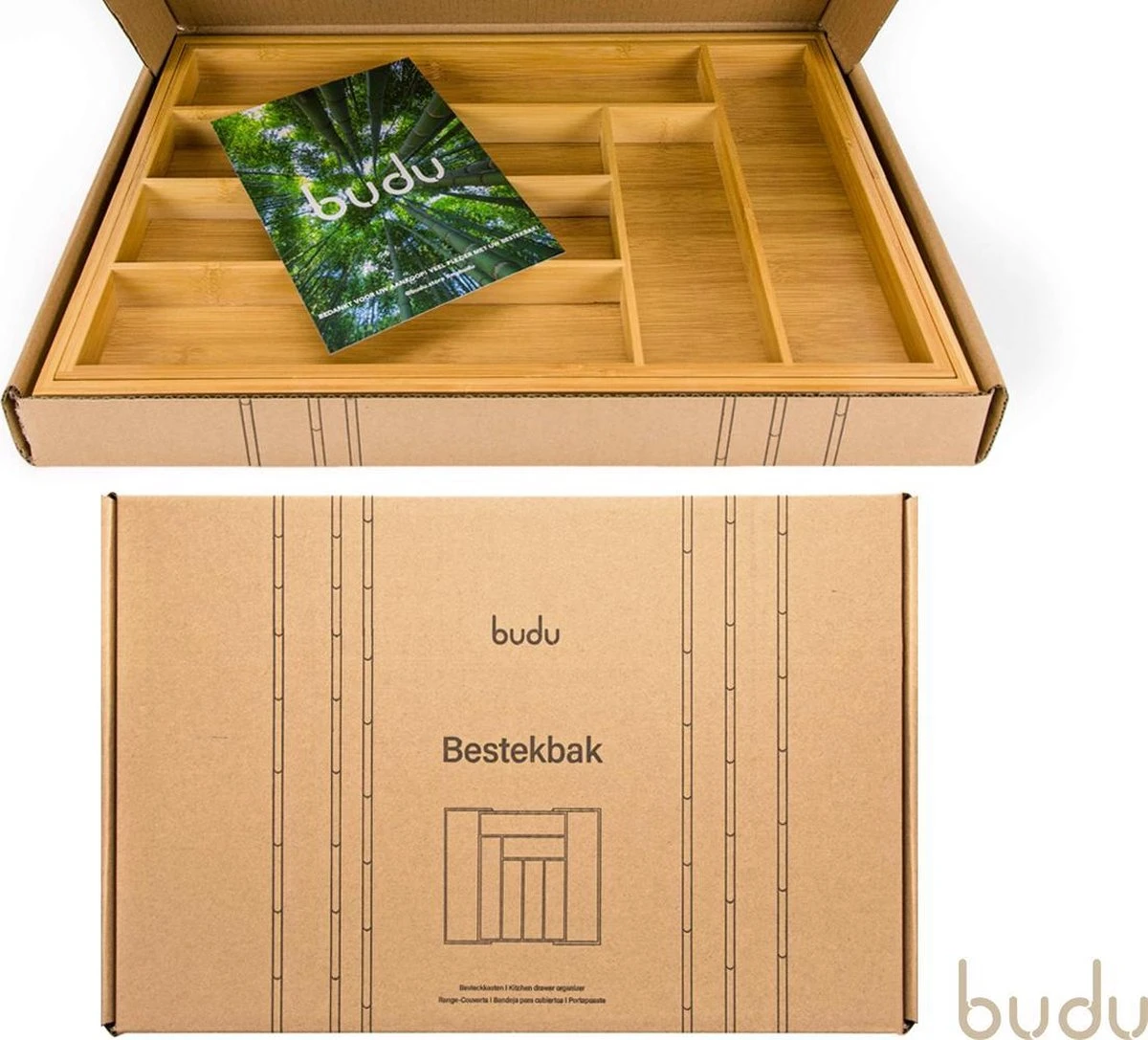 De Budu bestekbak is onmisbaar in elke keuken. De bestekbak is gemaakt van 100% duurzaam bamboe. Bamboe is een zeer sterk en slijtvast materiaal. Daarnaast heeft het een luxe uitstraling. De bestekbak is in de breedte uitschuifbaar. Hierdoor past de bestekbak in vrijwel elke keukenlade. De bestekbak beschikt over maximaal 8 compartimenten, hierdoor kunt u al uw keukengerei netjes opbergen. De bestekbak is ook te gebruiken als organizer voor andere producten, zoals kantoorartikelen, gereedschap of make-up.