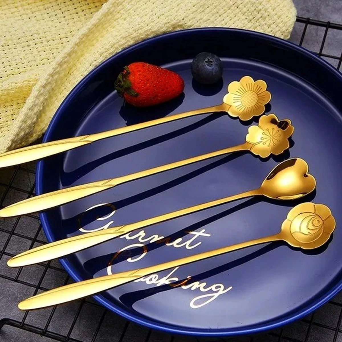 Een set van 8 lange goudkleurige RVS Bloem Motief Lepels van Fako Bijoux® voor een scherpe prijs. Deze lepels zijn ruim 17cm lang en te gebruiken als lange koffielepel, dessertlepel, ijslepel of als lepel in een lekkere cocktail. Het leuke motief zorgt aan tafel voor een lach op ieders gezicht. Met deze lepel komt u altijd tot de bodem van het glas en hoeft u ook niet bang te zijn dat de lepel onder het schuim of ijs zoekraakt. U ontvangt vier verschillende modellen en van elk model 2 stuks. Geleverd in een velours opbergzakje.