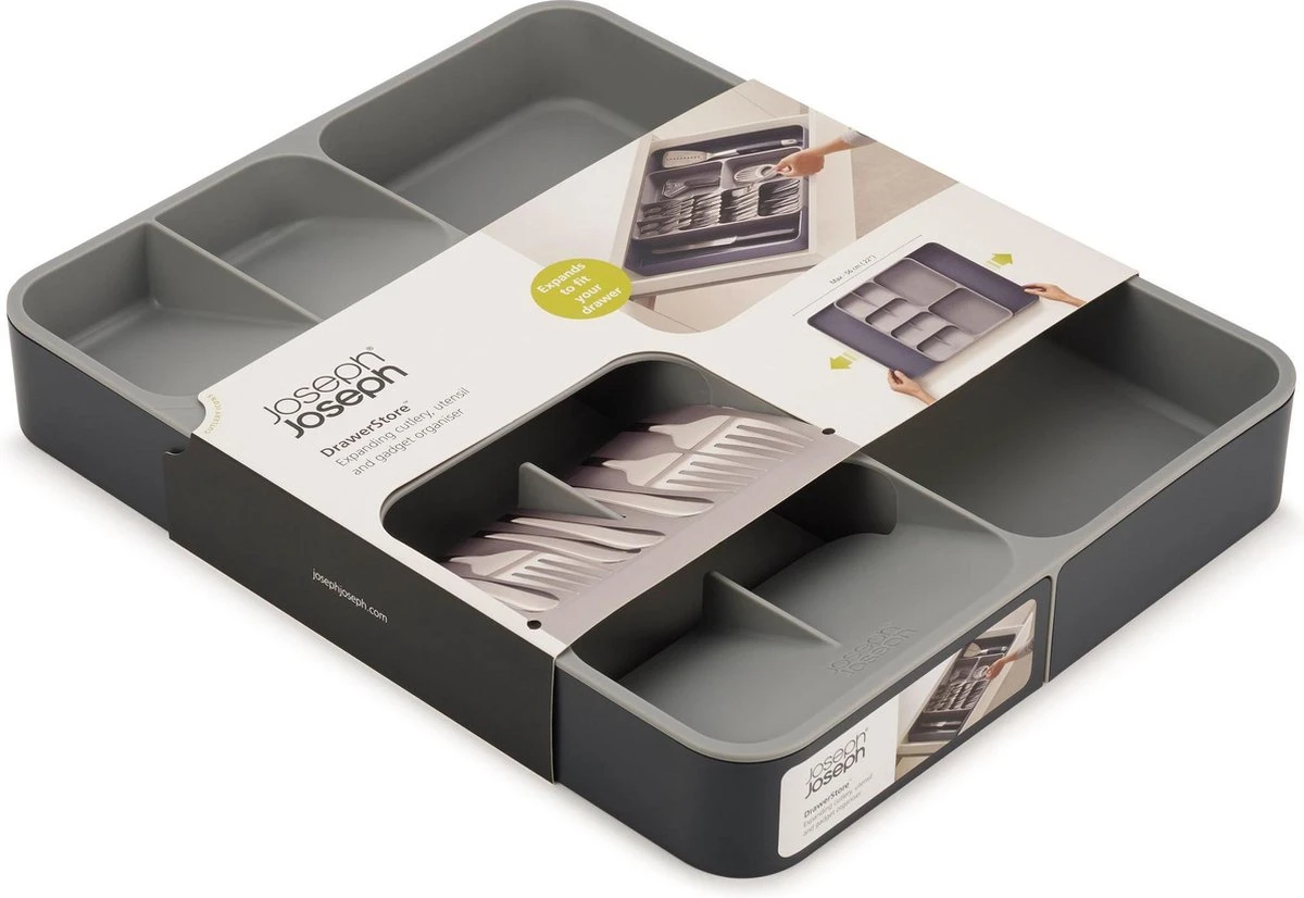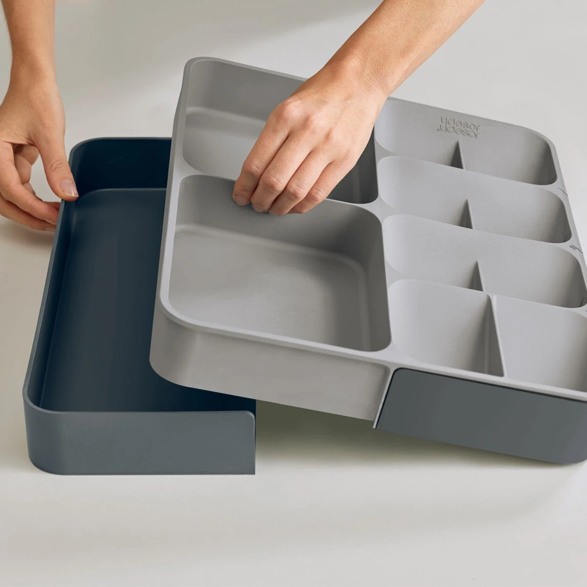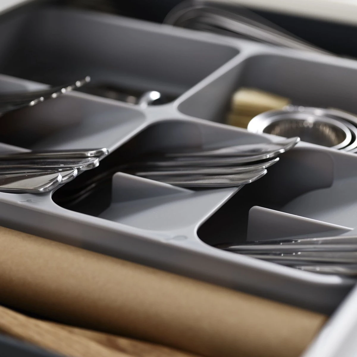 Met deze bestek organizer van Joseph Joseph is de vraag ‘hoe deel ik mijn besteklade overzichtelijk in’ beantwoord. Omdat de bestekbak uitschuifbaar is kun je zelf een besteklade indeling maken. Bespaar ruimte door je bestek boven elkaar te stapelen in de daarvoor bedoelde vakjes. Schuif de twee compartimenten uit om nog meer ruimte in je lade te creëren voor groter keukengerei zoals een broodmes en een spatel. In de DrawerStore collectie vind je nog meer handige organizers voor een mooie indeling van je besteklade.