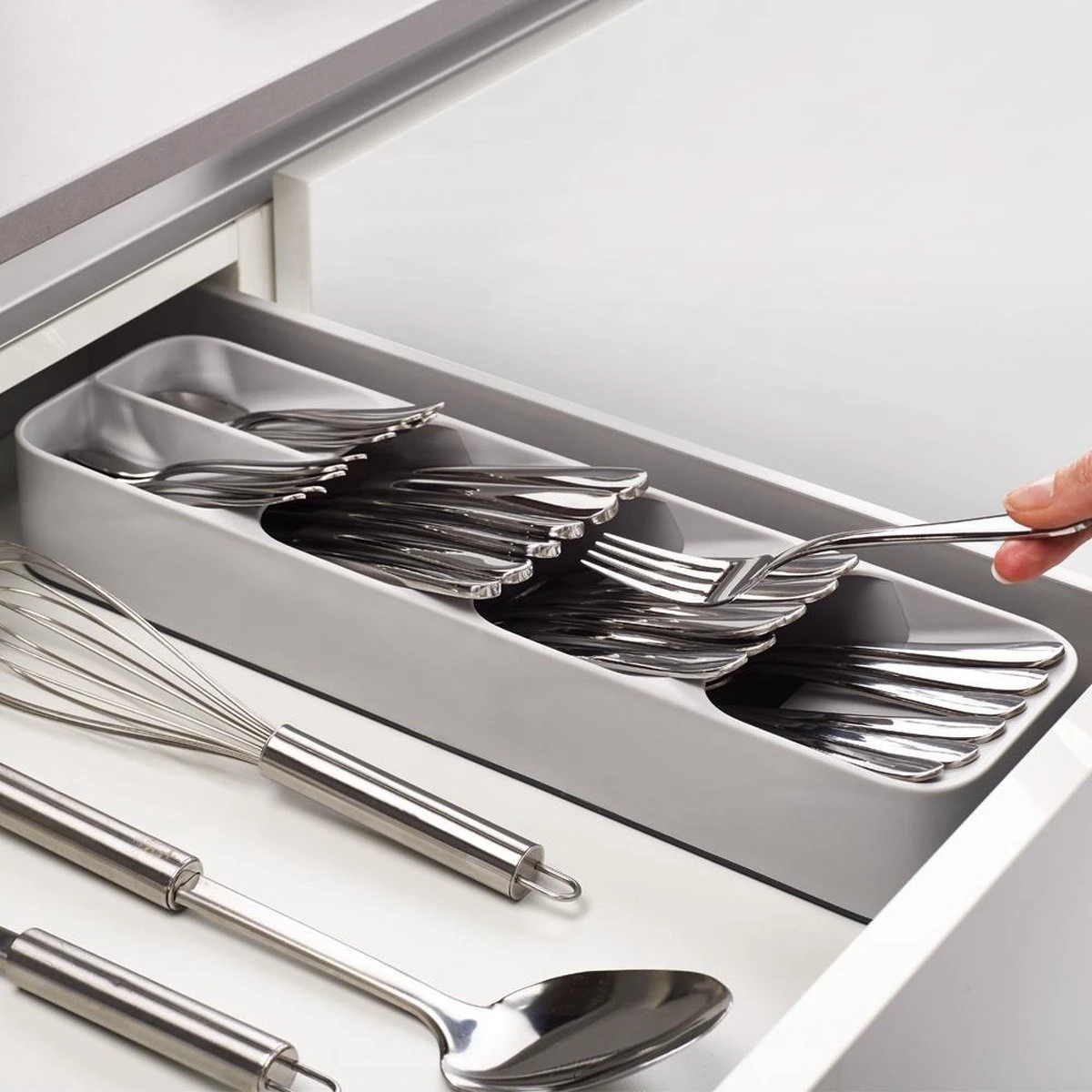 Met deze bestekbak van het merk Joseph Joseph kun je de ruimte in je keukenlade optimaal benutten – ideaal voor kleine keukens! De unieke constructie van deze keukenlade organizer creëert ruimte voor messen, vorken en lepels die in conventionele bestekdozen minstens twee keer zoveel ruimte nodig hebben.