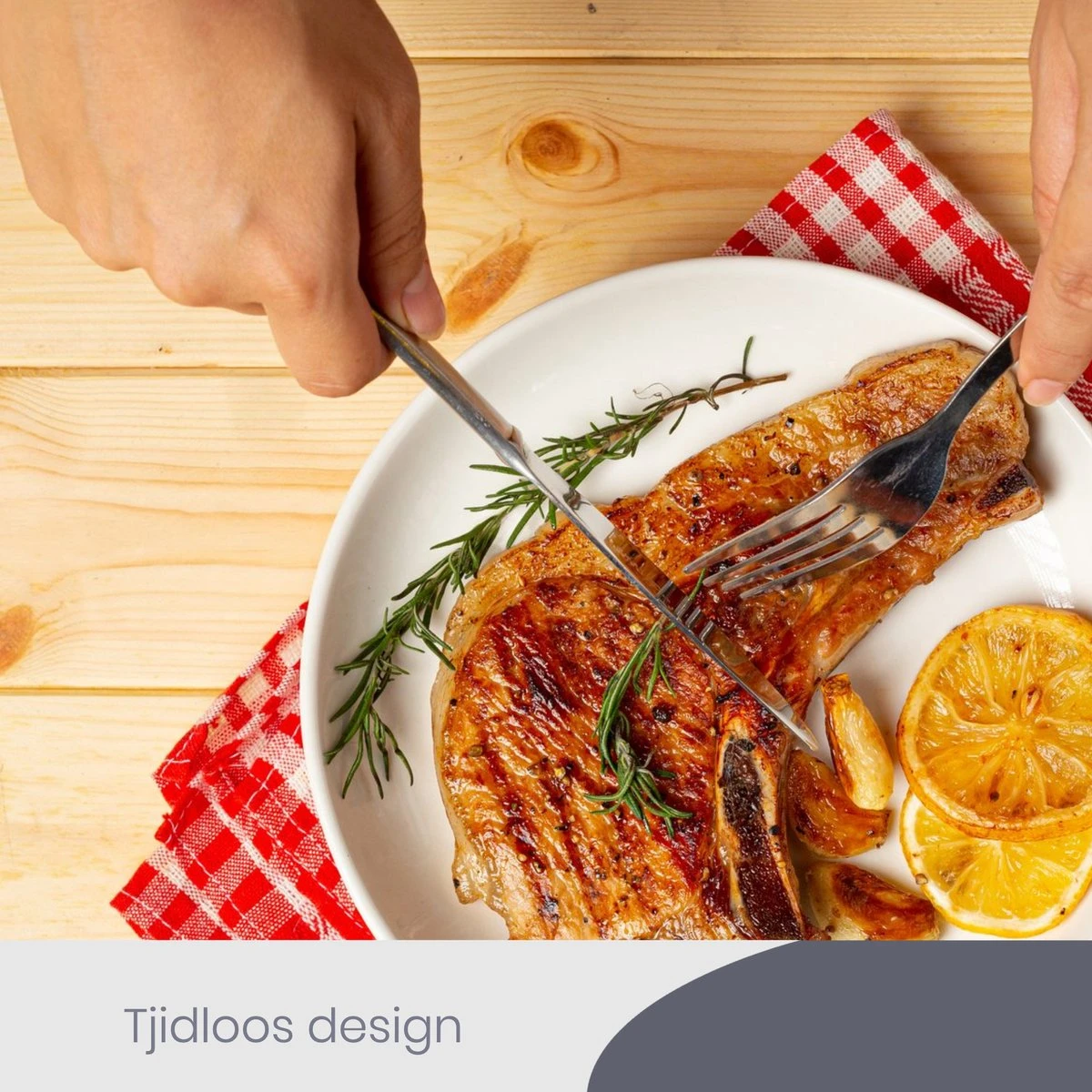 Met gepaste aandacht is hoge kwaliteit gewaarborgd tijdens de productie van de bestekset. Aangezien het gemaakt is van hoogwaardig roestvrij chroomstaal, blijft de kleur en glans mooi. Wel raden we aan om schuursponsjes, bleekmiddel en soda te vermijden. Gebruik verder na het afwassen een zachte doek om het bestek af te drogen.