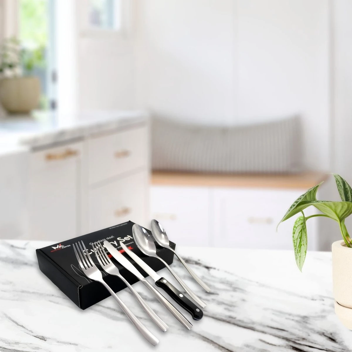 Master knives biedt een complete 36 delige bestekset voor een compleet diner. Je beschikt over een zestal tafelmessen, tafelvorken, eetlepels en om het compleet te maken nog een koffielepel. Mocht je iets willen toevoegen ter decoratie, dan raden wij de kleurencombinatie aan met koper, wit, zwart, zilver of hout. Met hout wordt de uitstraling ietwat landelijk, waar zwart, staal en zilver meer industriële gevoelens oproepen. Waar ga jij voor?