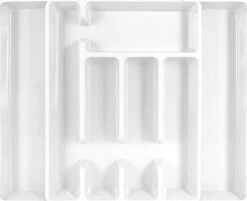 Een uitschuifbare bestekbak, gemaakt van kunststof. Door de zijkanten uit te trekken wordt de bestekbak/bestekhouder groter, waarmee u 5 tot 7 vakken kunt creeren. Afmeting ingeschoven bestekbak: 27 x 36,5 cm. Afmeting uitgeschoven bestekbak: 44 x 36,55 cm. Hoogte: 4.5 cm. Materiaal: kunststof. Bestekhouders/bestekbakken keuken opberg accessoires.
