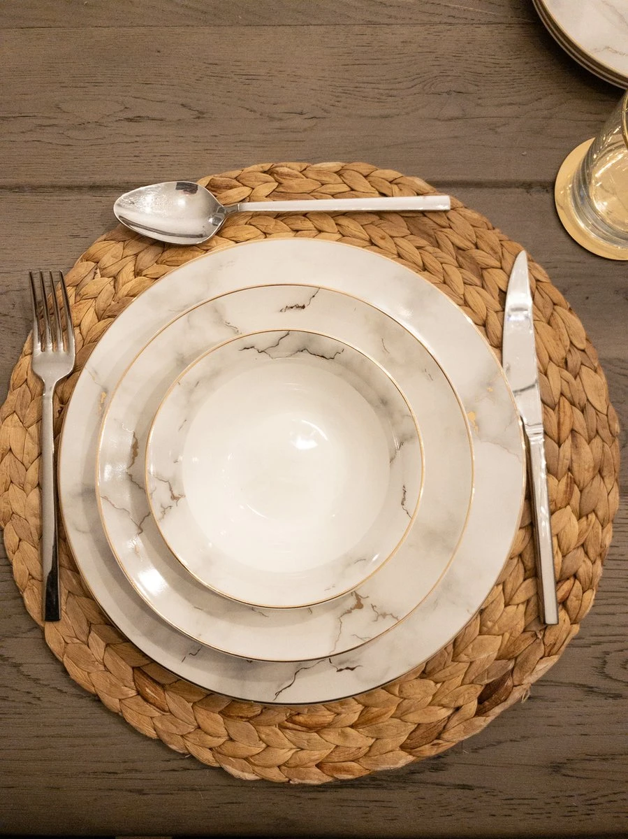 De serviesset van Selinex heeft een chique gouden rand en een natuurlijke marmeren look. Grote set voor ontbijt, tapas, diner en meer. Perfect voor een gezellig diner thuis. Deze serviesset bestaat uit 25 onderdelen, geschikt voor 6 personen. Met de Selinex serviesset geniet u elke dag van een perfect gedekte tafel.