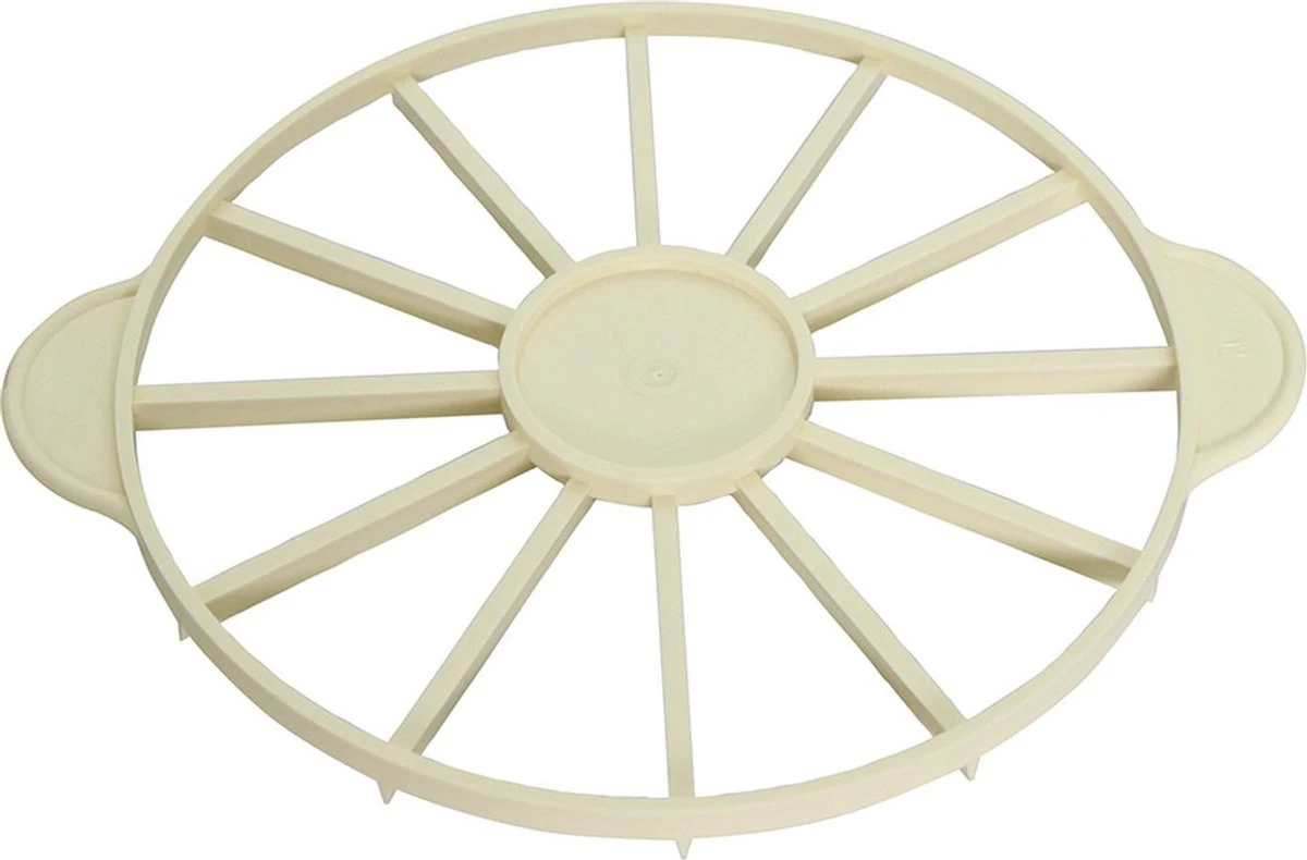 Kunststof taartverdeler 12-delig met een diameter van 265 mm. Met behulp van deze taartverdeler kunt u de taart gemakkelijk in 12 gelijke delen snijden, voorzien van twee handgrepen.